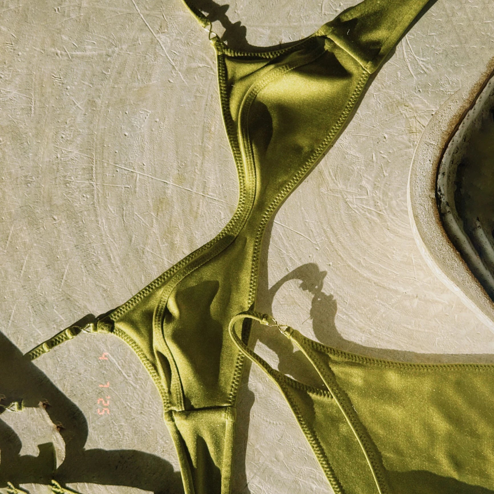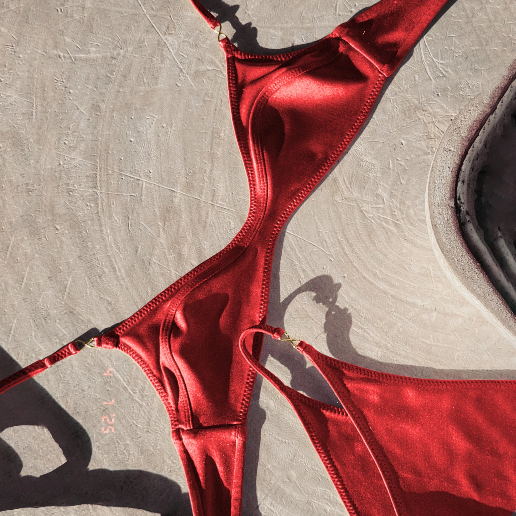 Conjunto de bikini dos piezas confeccionada en tejido elástico con acabado satinado. Diseño de corte minimalista con costuras vistas y detalles metálicos en los laterales. Ajuste ceñido al cuerpo.