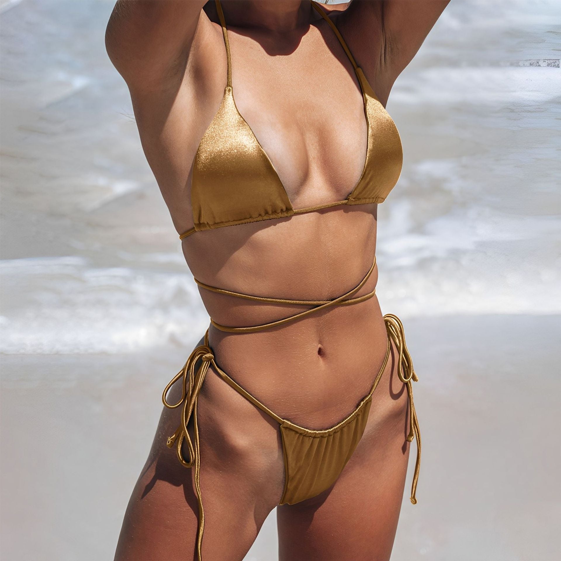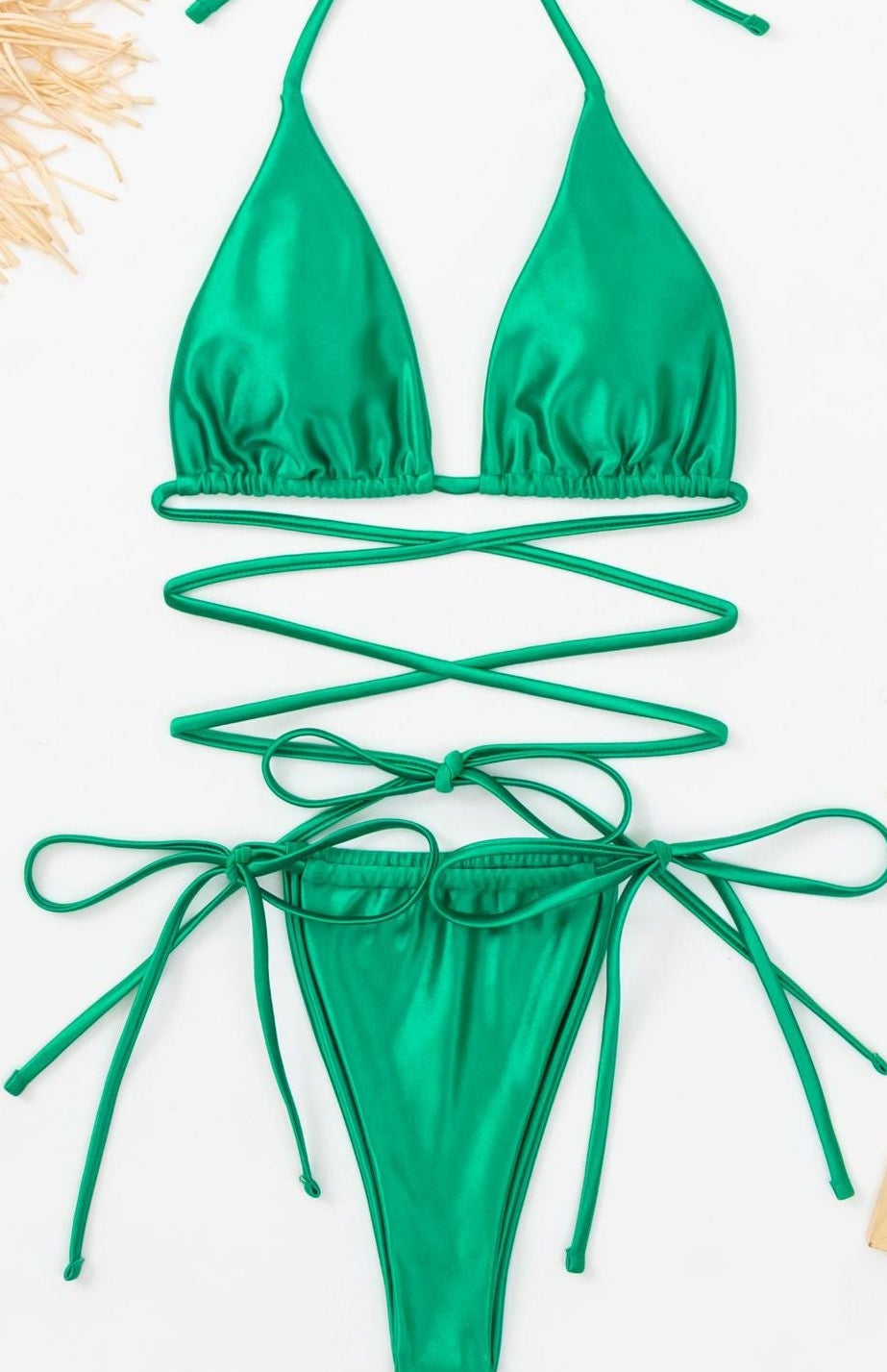 Brazilian-cut bottoms with adjustable side ties and wraparound strap details at the waist.