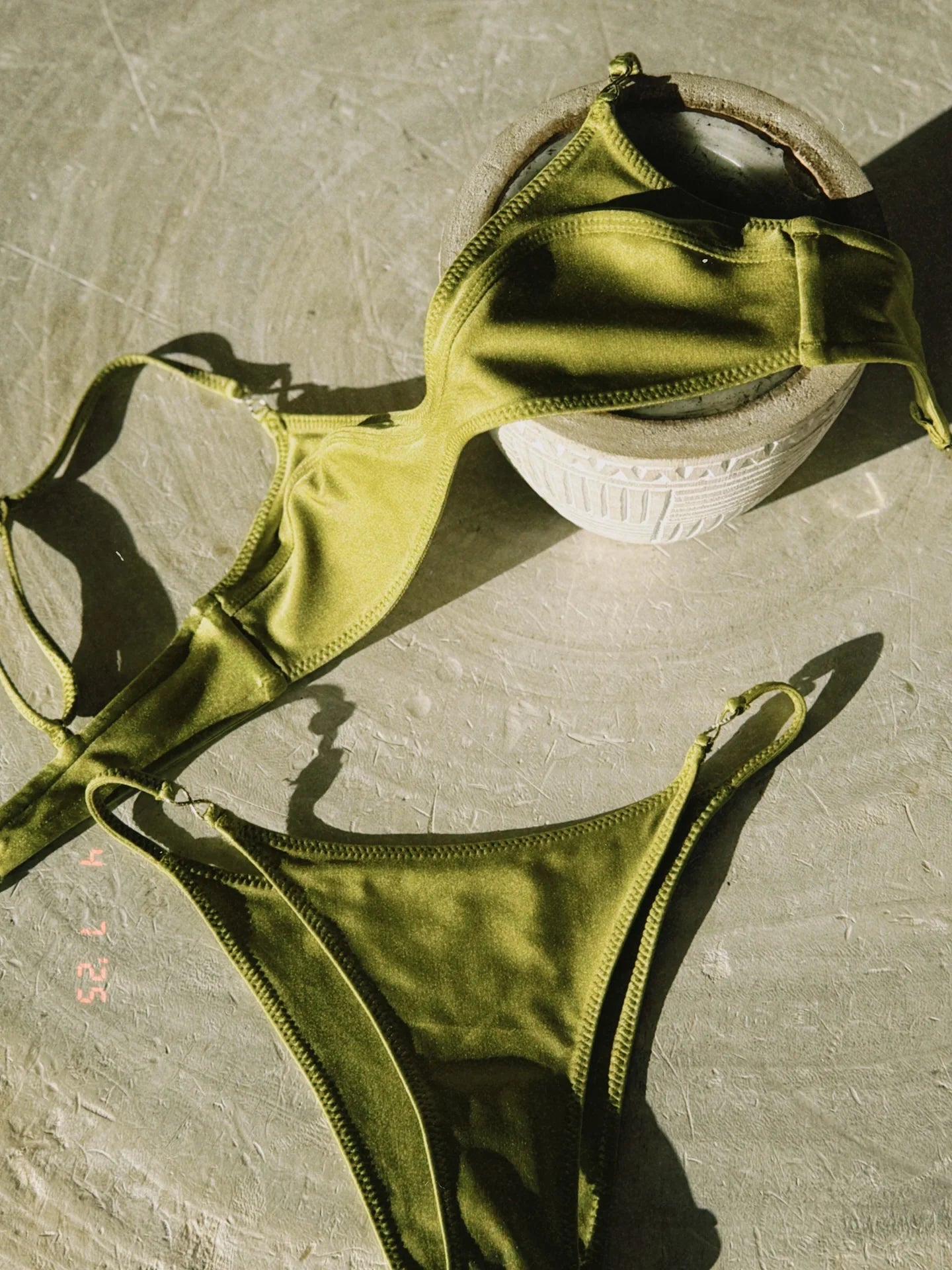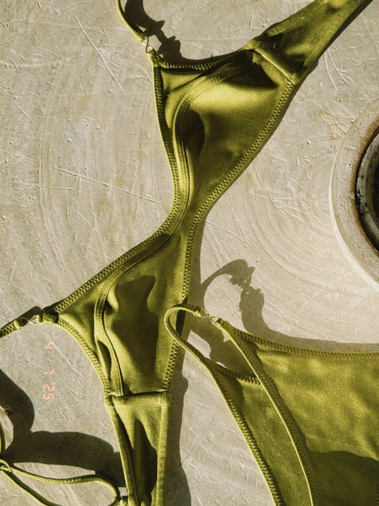Two-piece bikini made from stretchy fabric with a matte finish. Bralette-style top with a rounded neckline and thin adjustable straps featuring metallic details. Structured design that provides light support. Low-rise bottoms with thin sides and matching metallic accents. A minimalist design in a solid color, perfect for a sophisticated and modern look.